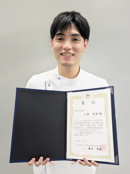 中央放射線部の小倉有登さんが大阪府診療放射線技師会から表彰を受けました。