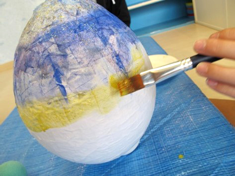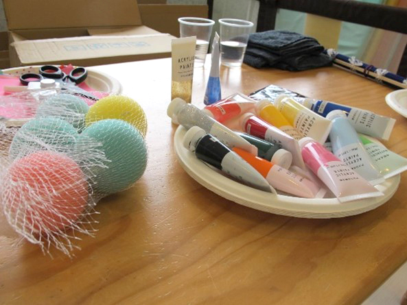 色とりどりの絵の具やスポンジボール、ブラシで仕上げます。