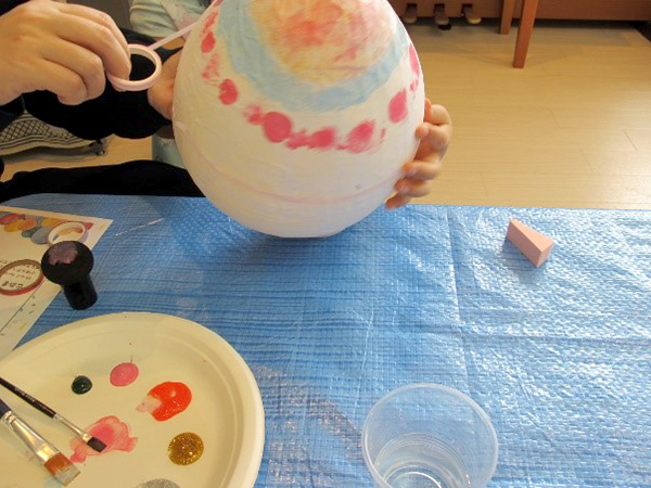 当院では小児科に入院している子ども11名、保護者7名がイベントに参加しました。子どもたちはランプシェードに絵の具で色付けをしたり、シールを貼ったりしながら真剣に制作に取り組んでいました。