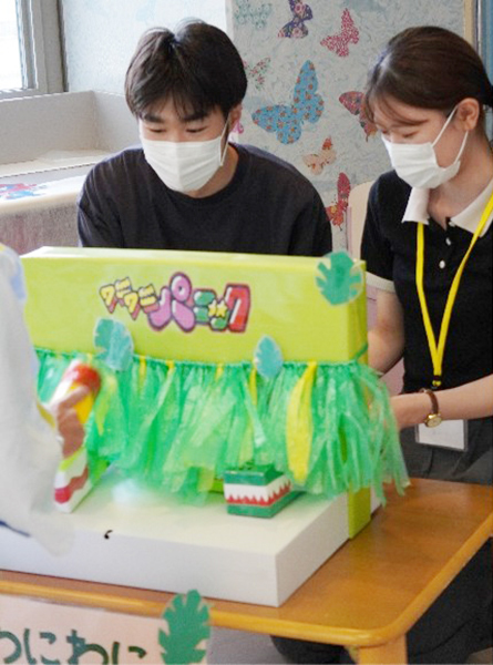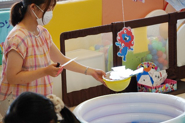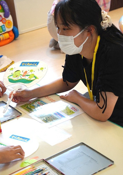 参加者の子どもたちは学生ボランティアと一緒にオリジナルうちわの制作をしたり、さかなつりやワニワニパニック、わなげのゲームを楽しみました。
