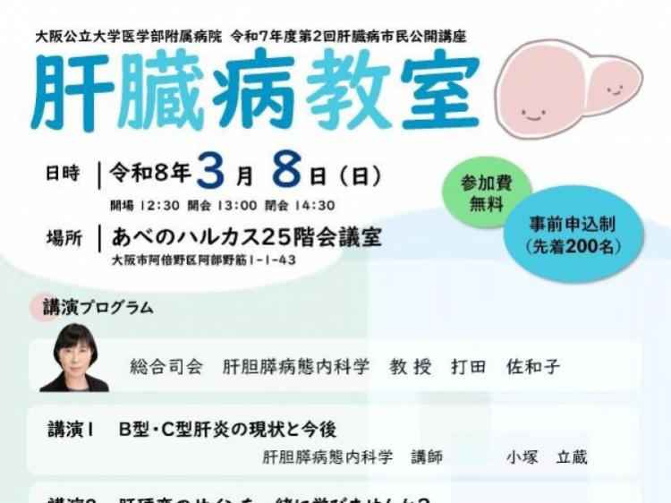 2026年3月8日(日)にあべのハルカス25階会議室にて肝疾患に関する市民公開講座を対面開催します(定員200名を予定)。