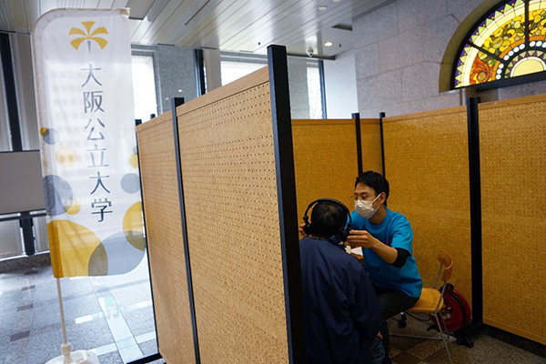 そのハートフルフェスタで市民の皆様の聞こえ・ふらつき検査をしました。当日は多くの地域住民の皆様にご来場いただきました。「年とともに聞こえがよくないので、この機会はよかった」「自宅近所にある公立大学が市民向けにこのようなイベントに出店していることは非常に喜ばしい」などの声をいただきました。
