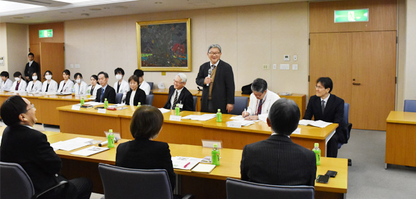 当院2年次研修医は、青森県内の協力病院で1か月間地域医療(へき地医療)研修を行うことができます。本地域医療研修は、平成19(2007)年度から始まり、今年度は34(昨年度26)名が、研修を行いました。これまで266名が青森県内で研修しております。今回の意見交換会では、青森県からは三村知事、若宮圭一五戸町長、一戸雅之大間病院長、安藤敏典五戸総合病院長、村上祐介三戸中央病院副院長、山中健康福祉部医師確保対策監、藤本健康福祉部良医育成特別支援推進員、小川良医育成支援特別顧問はじめ15名の方々がお越しになりました。