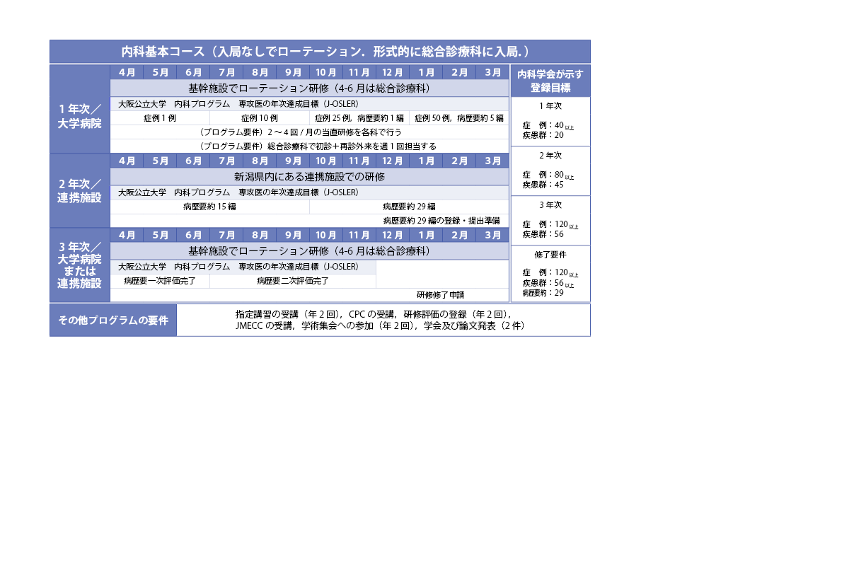 専門とする診療科が定まっていない、様々な診療科をローテーションしたい先生にお勧めするコースです。本コースでは、総合診療科に所属して内科領域の全ての診療科をローテーション研修します。原則、2ヶ月を1単位として、1年目及び3年目に計10科を当院または連携施設でローテーションします。2年目は、地域医療の経験と症例数の充足していない領域を重点的に府外の連携施設で研修します。原則として新潟県内の連携施設で研修します。(大阪府の設置する医師キャリア形成支援プログラムへ参加可能)